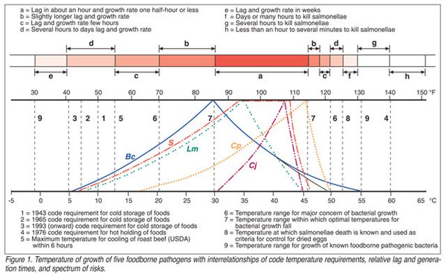 Dưới đây là sơ đồ phát triển của vi khuẩn ở các nhiệt độ khác nhau, kết quả nghiên cứu của Bộ Nông nghiệp Mỹ USDA, các vi khuẩn gây ngộ độc thực phẩm phổ biến phát triển tốt nhất ở nhiệt độ từ 25-35 độ C, nhiệt độ thường ở Việt Nam.